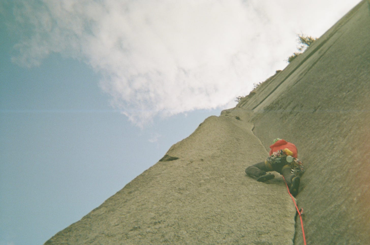 We link up in the afternoon midweek and hike through the campsite to the start of the route. We rack up and I take the first pitch. I’m already feeling a little out of it. It’s 5.9, but I feel unconfident working my way up the pitch. I finish and belay him up.