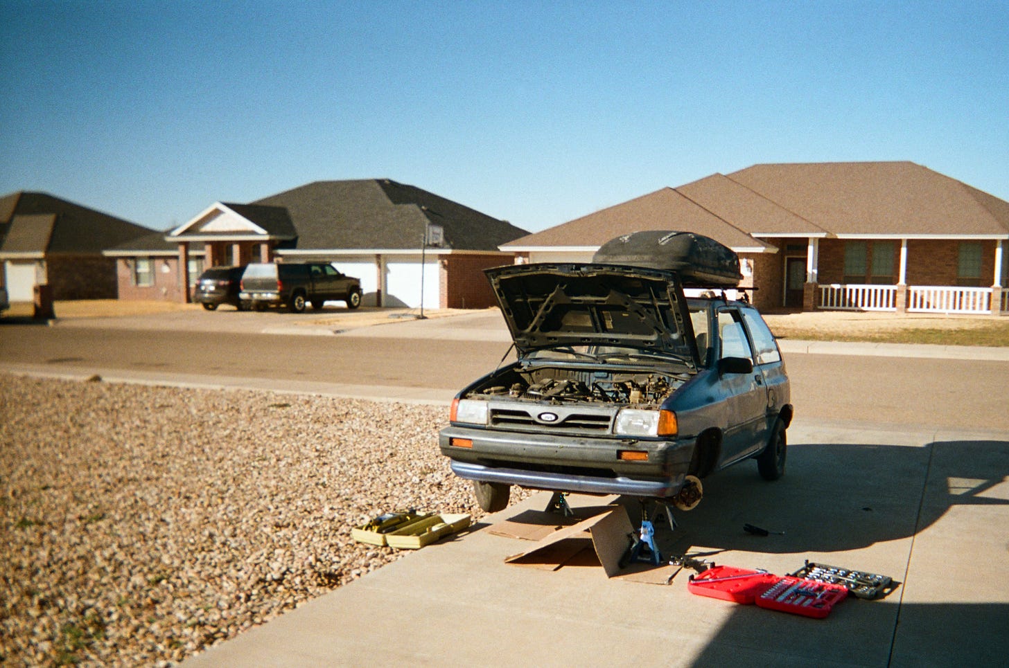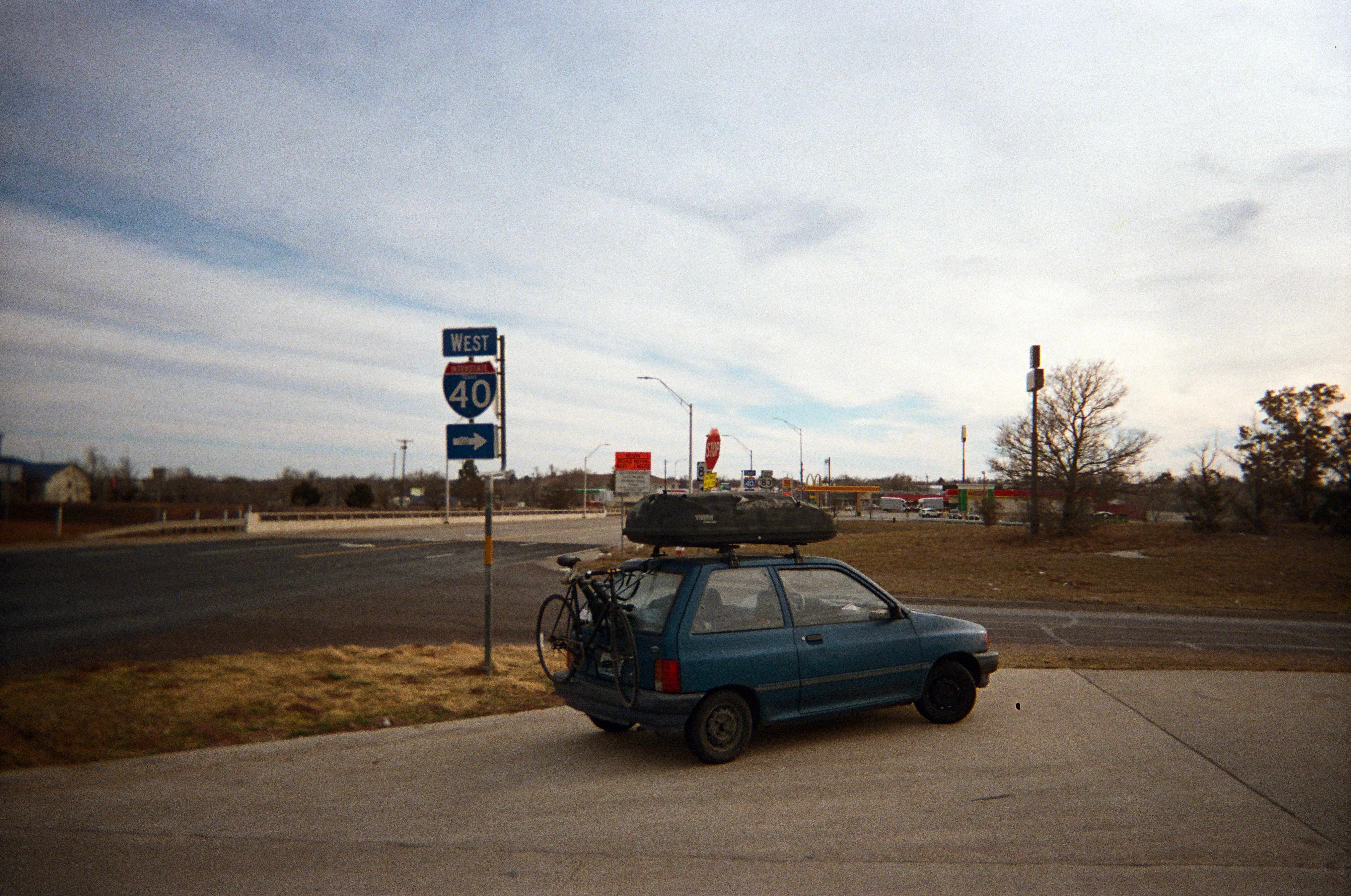 Instead of flying, I opt to drive. My noble steed for this journey will be “Barry Bluejeans,” my 1991 Ford Festiva. I tell my boss I can make it there in two weeks. In my own internal calculus, two weeks is the amount of time I need to make it to the opposite coast. Two weeks gives me enough time to deal with the inevitable car maintenance and repairs I will have to perform on the way there. Before I leave Kentucky, I attempt to get an alignment done. The shop informs me that my rack and pinion is completely worn out, and it will be impossible for them to align it. I take the car to my friend Will’s house, who is arguably the chief Ford Festiva guru nationwide. He looks at my car, and informs me that yes, my worn rack and pinion is preventing a proper alignment and probably will eat through my tires on the way there. “Do you think I’ll make it to California before the tires die?” I ask him.